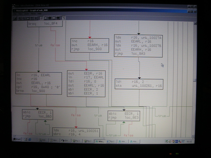 In den nächsten Wochen waren mehrere Hacker damit beschäftigt, den ausgelesenen Assemblercode zu verstehen und zu dokumentieren. Dazu verwendeten wir AVR-Studio und Ida Pro. Den Scramble Code (zum Berechnen der Ausleih- und Abgabecodes) fanden wir relativ schnell, da sich dort eine Menge rotate-und-shift-Befehle befanden. Den Initialisierungscode erkannten wir wieder, da wir wußten, daß sich der Motor beim Einschalten zweimal herumdreht. So konnten wir das Gelernte immer wieder an unserem Prototyp auf Richtigkeit überprüfen.